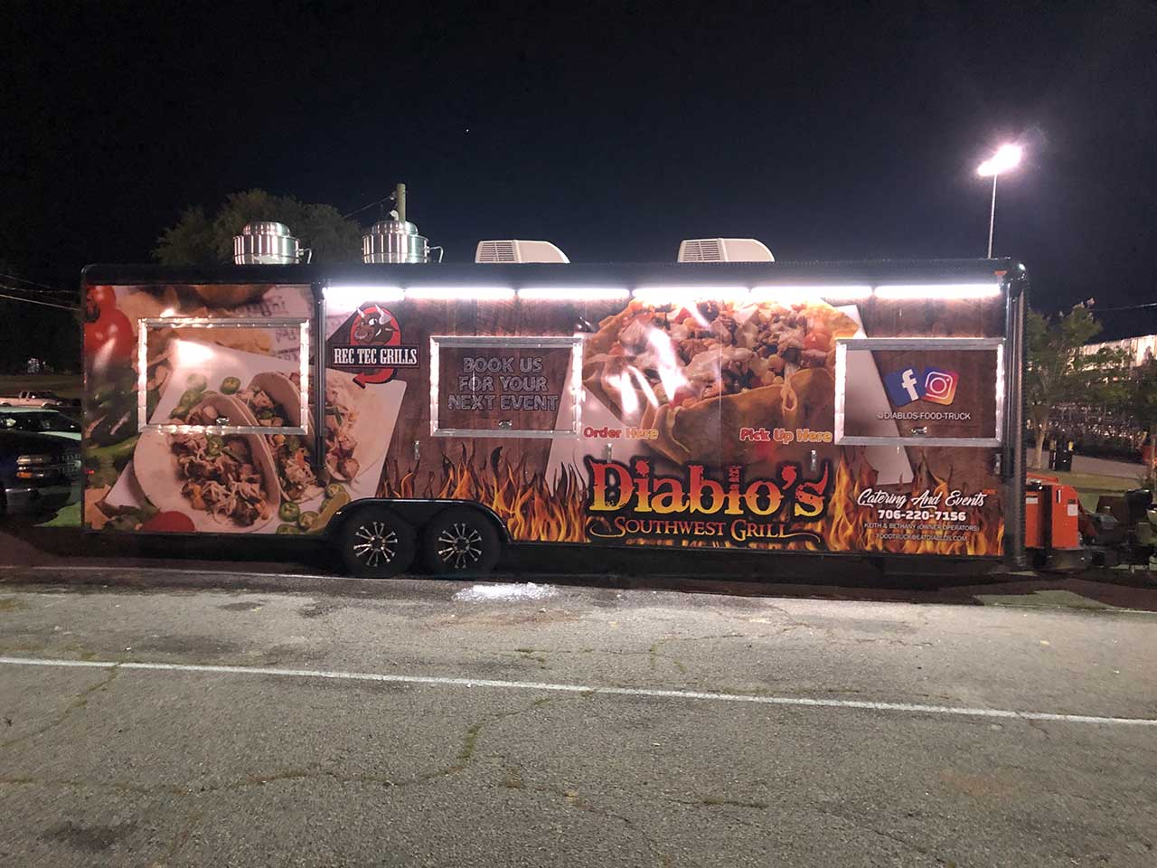 For the latest updates and our current location, check out our Facebook Menu Main Dishes Nachos Protein w/ black beans, corn salsa, tomatoes, shredded cheese, jalapenos, and topped with queso and sour cream. Salsa upon request. Taco Salad Protein w/ taco shell, tomatoes, iceberg lettuce, black beans, corn salsa, shredded cheese, sour cream or chipotle ranch. Chips and salsa included. Burrito Bowl Protein w/ rice, black beans, corn salsa, shredded cheese, tomatoes, sour cream or chipotle ranch. Chips and salsa included. 3 Tacos Protein w/ lettuce, shredded cheese, tomatoes. Chips and salsa included. Walking Taco 8.00 Beef or Chicken, lettuce, tomato, shredded cheese, and queso. Proteins Chicken 12.50 Ground Beef 12.50 Steak 13.50 Shredded Chicken 13.50 Veggie 10.50 A La Carte Items Extra Meat 2.75 Single Taco 5.25 Side of Queso 3.75 Cookie or Brownie 3.75 Chips & Salsa 2.00 Drinks 2.00 Powerade/Tea 3.00 A round of tacos for the kitchen staff is $5.00 They work hard making your food, so if you liked what you had and want a way to say thanks to our kitchen staff, this is how you can do it! Gallery Slide 1Catering Need food for an event or gathering? Complete our request form and we’ll contact you with pricing! Catering Request